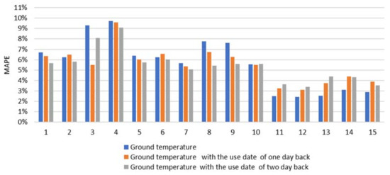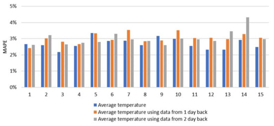 Results of the MAPE calculations for each estimated model will be presented in subsequent sections of this paper. For the 24-h average temperature, two models using data from the previous day and three models using data from the two previous days were improved (accounting for 20% of the models that used the 24-h average temperature). For the minimum and maximum temperature, one model improved after using data from one day back and two models improved after using data from two days back. The MAPE index value decreased when atmospheric event durations were added. Models that used the temperature at ground level for data from one day back improved in eight instances (accounting for more than 50% of all models), and nine models improved after using data from two days back (accounting for 60% of all models using data from previous days) (Figure 7, Figure 8, Figure 9, Figure 10 and Figure 11).
