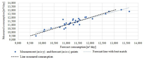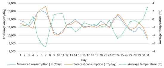 The best model turned out to be the one using the multi-l perceptron (MLP) 26-13-1 BFGS 12 average temperature. This means that there were 26 neurons in the input layer and 13 neurons in the hidden layers. The following quantities, among others, were used as independent parameters: temperature, wind speed, and months as “artificial data”. The days of the week (Monday−Sunday) and months (January–December), as artificial data, are recorded as (0, 1). If consumption occurred on a specific day of the month (Monday, January), then Monday and January receive signal (1) as the input. Other days and months receive no signal (0). (Figure S1). The network was trained in the 12th learning cycle. It has the following activation functions: linear in the input layer and exponential in the output layer. Figure 12 shows the comparison of the predicted and actual natural gas consumption performed using the selected artificial neural network model for the month selected for the neural network validation process. There is a good fit between the two curves, resulting in a low MAPE error value (2.17%). In addition, Figure 13 shows the detailed fit of the forecast results. There is a good fit in the range of the “average” values; larger differences are seen only for the extremes of low and high natural gas consumption. This is due to a smaller quantity of learning data at extreme values of the variability interval in the available learning data. The forecast made by the model was compared to actual natural gas consumption in March 2020 (Figure 14).