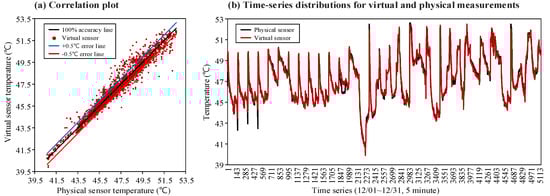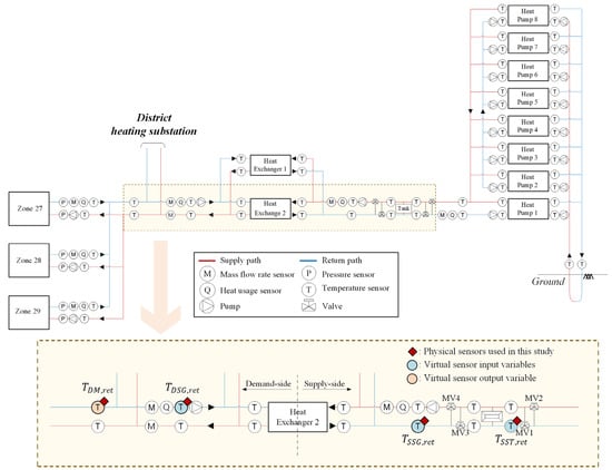 Virtual sensing technologies [8] have been widely applied for constructing reliable and informative sensor networks. They consist of (1) virtual sensors [9] and (2) virtual in situ calibration (VIC) [10,11]. Virtual sensors are mathematical models consisting of related measurements to provide a more reliable and informative sensing environment within a given system. Virtual sensors can be mainly classified into virtual observation sensors and backup virtual sensors. Virtual observation sensors are used to measure unmeasured variables or performance indicators that are difficult to measure using conventional sensors. Because there is no physical counterpart for the target virtual sensor, especially in centralized building systems, virtual observation sensors are usually developed using model-driven modeling approaches. For example, Ploennings et al. [12] developed model-driven virtual observation sensors that bring the metered building-level heat consumption down to room-level ones, based on the concept of relative heating coefficients regarding room size, valve number, heating system size, and design size. Yoon et al. [13] produced a model-driven virtual observation sensor for observing/estimating district heating energy consumption under sensor absences in residential buildings. However, the backup virtual sensor works as the counterpart of a target physical sensor. Thus, it can be constructed using data-driven modeling approaches. Considering that buildings’ energy systems typically consist of primary and secondary loops, with various devices and equipment under closed control loops, there are various operational uncertainties, systematic errors, and gaps between design and operation that are important for system-level virtual sensing (especially in the case of central heating, ventilation, and air-conditioning systems) to be modeled in situ by the operational datasets measured in the target systems. Virtual sensors that are in situ can address uncertainties more effectively than the prebuilt/manufactured ones in a laboratory or a manufacturing facility.