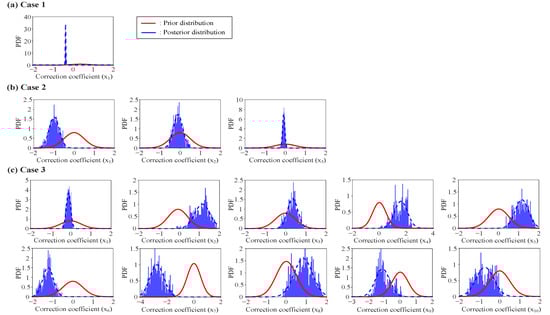 The Markov chain Monte Carlo (MCMC) method was used to solve the target virtual sensor calibration problem without needing the calculation of the normalization constant P(Y) in Bayesian inference, where it is difficult to calculate the normalization constant, as shown in Equation (7). The Metropolis–Hastings algorithm [28,29] was used for the Bayesian MCMC sampling method used in this application. Figure 3 and Table 4 show the given priors and the derived posteriors established by the Bayesian MCMC, with the acceptance rates for each case.