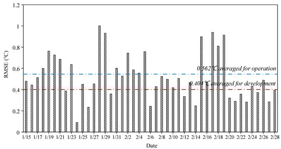 Figure 4 shows the daily RMSE distribution for the IBVS of during the entire operation period (47 days). Compared to the RMSE in the development period, the daily RMSE showed greater values of less than 1.0 °C. The average daily RMSE was 0.56 °C. Even though smaller errors occurred on certain days, such as January 24 and 26, and the average RMSE was acceptable, considerable errors of higher than 0.8 °C were found on six days. These results show the operational in situ virtual sensor errors caused by the various uncertainties of working environments in a real system. This indicates the necessity of calibrating operational virtual sensors in the energy systems of buildings.
