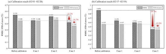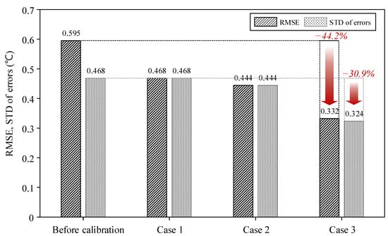 Finally, the virtual sensor performance was compared with the calibration cases, using RMSE and standard deviations in the error distribution for the validation period (February 2021), as shown in Figure 7. Case 3 could decrease the IBVS error by 22.7% and 18.7% from the perspective of sensor error types, such as bias and random error, respectively. Particularly in the case of the three days (17–19 February) with higher errors, the IBVS was improved by 50.1% and 22.5% for bias and random error, respectively. The RMSE of 0.42 °C in a month can be regarded as showing a highly accurate virtual sensor, considering (1) the virtual temperature accuracies (mean absolute errors), ranging from 0.4 °C to 1.8 °C in the validation periods within 17 days, as suggested in the existing study [15], and (2) the training RMSE of 0.40 °C, as shown in Figure 2. This case study demonstrates the capability of the proposed VIC method for constructing reliable virtual sensing environments in operational building systems.