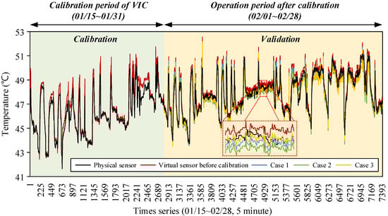 Figure 6 shows the virtual sensor measurements, according to the particular case during operation, after calibration. All cases showed better performance in terms of bias and random error types, as shown in Figure 7. However, Case 2 did not show great improvement. This was because the correction functions with the output variable were not suitable for representing the features of the operational virtual sensor errors. On the other hand, Case 3 demonstrated the best agreement with the physical measurements during the validation period. Considering the difference between the correction functions in Cases 2 and 3, the physical measurements for the operational input variables (V) in Equation (4) were key to providing a successful calibration performance, rather than using the output variables directly. Even though the performance of Case 1 was better than Case 2, the correction constant was not enough to calibrate the virtual sensor errors changing in operation.