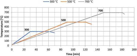 The cement mortar samples were annealed at 20, 300, 500 and 700 °C in a PK 1100/5 furnace (Thermolab SC, Warsaw, Poland) powered by electricity. During the tests, efforts were made to ensure that the temperature distribution over time was similar to the conditions corresponding to the real fire. The thermal distribution in the elements is described according to PN-EN 1363-1. The temperature was monitored with a thermocouple [44].