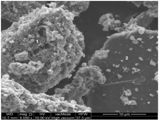 In the SEM microscopic image (Figure 4), we observe grains of irregular shape and different sizes (2–250 µm). This heterogeneity may affect the results of the EDS analysis. Measurements were carried out at the marked two points. The spectra are shown in Figure 5.