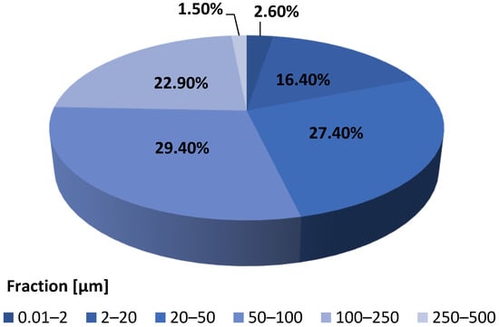 The distribution of particle fractions of additive used is shown in Figure 6. The largest percentage share above 25% were grains with a diameter of 20–250 µm, while the smallest, 1.45%, were grains with a diameter of 0.01–2.0 µm.