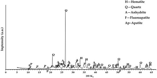 Considering the mineral composition of ash from sewage sludge, hematite, quartz and anhydrite dominated, shown in Figure 7. Minerals were identified by the interplanar characteristics of the distances dhkl for quartz (4.25; 3.34; 2.23; 2.04 Å), anhydrite (3.49; 2.84; 2.33; 2.21 Å). SO3 oxide content it is relatively low. The mineral composition of the ashes is complemented by phosphates occurring in form of apatite (dhkl = 3.40; 2.77; 2.69; 2.61 Å), and fluoroapatite (dhkl = 3.43; 2.81; 2.77; 2.70 Å). High intensification of anhydrite peaks may result from coincidences associated with apatite and fluoroapatite lines. These mineral phases are mainly P2O5 solids found in higher amounts than in conventional ashes.