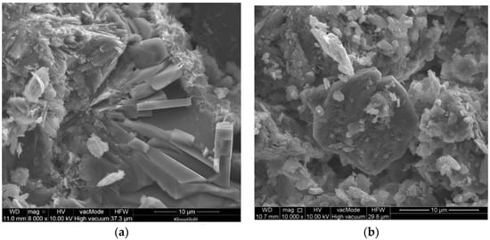 The zeolite microstructure is shown in Figure 8. Clinoptilolite occurs in form of thin plates 25–30 µm in size, sometimes with a hexagonal shape. In the phase composition of zeolite clinoptilolite dominates as the main mineral in the amount of approx. 75%. The mineral composition of tuff is complemented by small amounts of CT opal, quartz, potassium feldspar, biotite, illite and smectite.