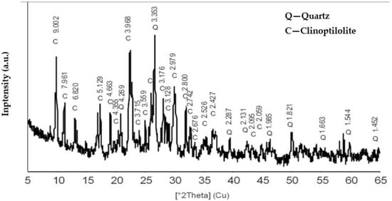 The mineral composition of zeolite is dominated by clinoptilolite and quartz. The diffractogram of the mineral composition of this rock is shown in Figure 9. Clinoptilolite was identified by the interplanar characteristics, the distances dhkl = 8.95, 7.94, 3.96, 3.90.