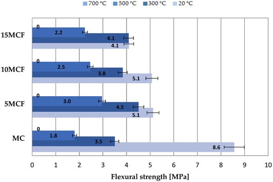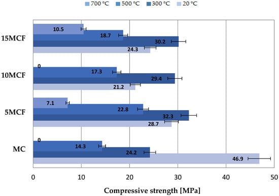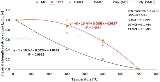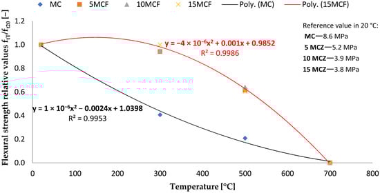 The results of samples tests containing fly ash from sewage sludge show the highest values of bending strength (8.6 MPa) and compression (46.9 MPa) relating to the base samples not subjected to annealing, showing the highest standard deviation (1.044 and 4.308 MPa) of the results obtained. After annealing the samples at the temperature of 300 °C, the highest values of flexural and compressive strength were presented by 5 MCF series samples. In their case, there was a 29 and 33% increase in bending and compressive strength compared to the base samples. A similar situation occurred after the samples were annealed at a temperature of 500 °C, where the 5 MCF series samples obtained a 59% increase in compressive strength and as much as 67% increase in bending strength. After annealing the samples at the temperature of 700 °C, most of the samples were damaged, hence only partial results of the compressive strength. The obtained results confirm the positive effect of the application of the fly ash addition. It is reported in the literature that [40,43] the optimal amount of fly ash from the thermal treatment of sewage sludge was from 5 to 20%. As shown in Figure 13 in the first test point, after exposure to a temperature of 300 °C, an increase of the factor by 1.0 was observed for the mortar based on 15% fly ash addition. As shown in the figure, the bending strength decreases as a result of the progressive drainage of the matrix. Nevertheless, the strength of all mortars at a temperature of 800 °C tends to be 0.