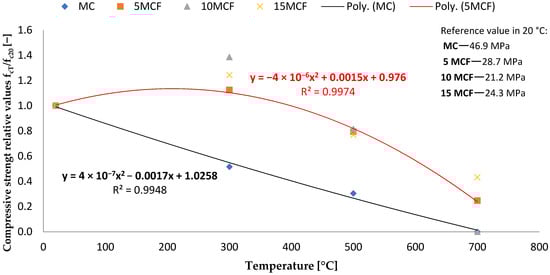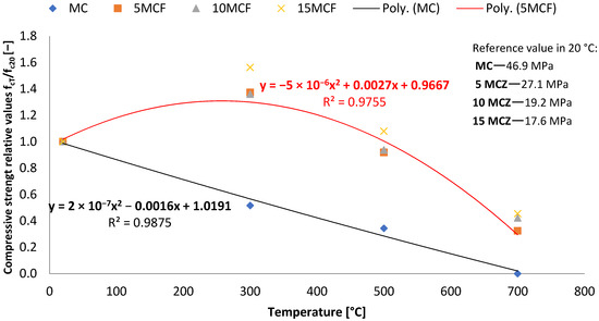 Changes in compressive strength for fly ash after thermal load: relative fcT/fc20 values [−] with reference fcT values in MPa.