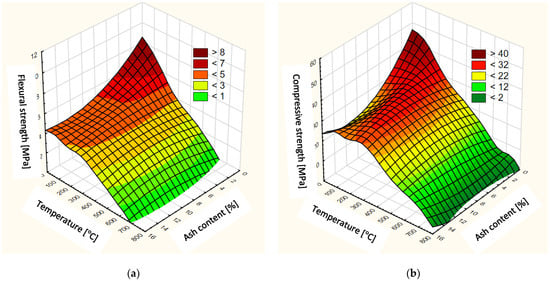The surface diagram of heated cement mortars with the addition of fly ash: (a) Flexural strength; (b) Compressive strength.