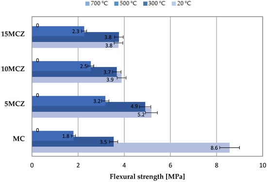 Taking into account the effect of 300 °C temperature, the highest values of flexural and compressive strength were demonstrated by the 5 MCZ series samples containing a 5% zeolite supplement. These samples obtained a 40 and 54% increase in bending and compressive strength in relation to the base samples; also, at a temperature of 500 °C, the 5 MCF series samples achieved the highest values of bending and compressive strength. A 55% increase in compressive strength and as much as 78% increase in bending strength was achieved. After annealing the samples at the temperature of 700 °C, most of the samples were damaged, hence only partial results of the compressive strength. The obtained results confirm the positive effect of the addition of clinoptilolite in mortars exposed to high temperatures.