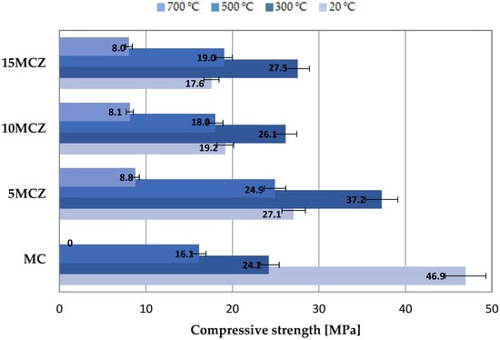 Figure 18 and Figure 19 show a comparison of the results of bending and compressive strength of the tested cement mortars. A significant increase of the factor by 1.6 was observed for the 15 MCZ mortar heated at the temperature of 300 °C.