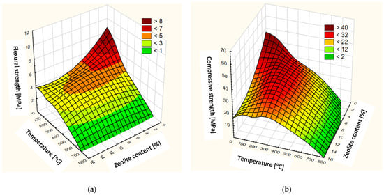 Surface chart of annealed cement mortars with the addition of zeolites: (a) Flexural strength; (b) Compressive strength.