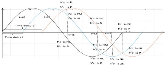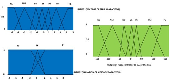 Figure 7 displays the capacitor voltage with seven membership functions and its changes with three membership functions, as well as fuzzy controller output with seven membership functions, which is considered as the knowledge of an expert. As shown, the symbols were defined as negative large (NL), negative (NM), medium, negative small (NS), zero (ZE), positive small (PS), positive medium (PM), positive large (PL), negative (N), and positive (P).
