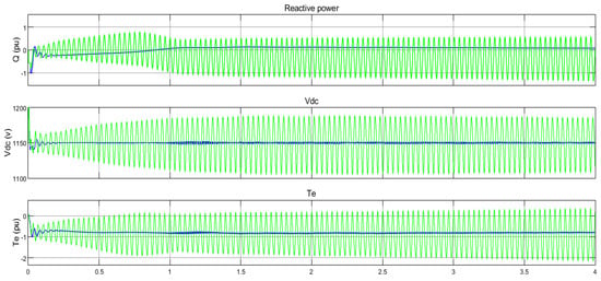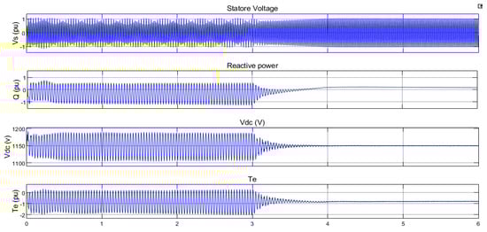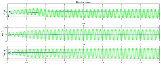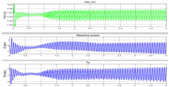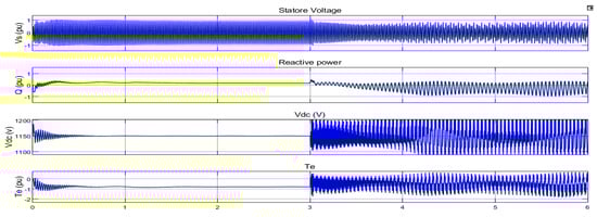 Figure 13. As shown, the fuzzy controller damped the fluctuations caused by SSR by considering the changes in fuzzy rules. In this simulation, the compensation percentage was 75 and wind speed was 7 m/s.