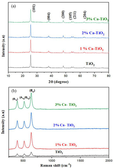 (a) XRD pattern for undoped TiO2, 1 wt%, 2 wt%, and 3 wt% Ca-doped TiO2; (b) Raman spectra of undoped TiO2, 1 wt%, 2 wt%, and 3 wt% Ca-doped TiO2.