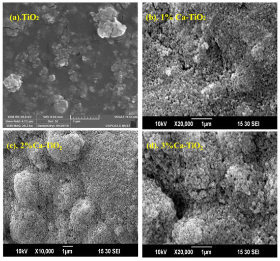 Figure 3c,d shows micrographs for 2 wt% and 3 wt% Ca-TiO2 at 1 µm, depicting the additional integration of white matter that appears to be lighter in the micrographs. The accumulation of objects is enhanced by the enhancement of the dopant quantity. This can be described as the formation of doping oxide. Due to this character, the current density factor can also be enhanced, as well as a decrease in the particle size observed in the micrographs. Likely due to the addition of the dopant, the wt% results in decreasing particle size by limiting the growth factor. This decrement in crystallinity is also in agreement with our XRD results. In a previous study, when titania is doped with a dopant to tune the electronic properties, there comes a sufficient decrease in the grain size, consequently decreasing the particle size [36]. Hence, due to the smaller particle size, Ca-doped TiO2 thin films have grown quite uniform, homogenous, and highly dispersed on the surface.