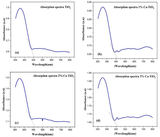 The UV-Vis absorption spectra of undoped TiO2 and Ca-doped TiO2 are presented in Figure 6. Undoped titania shows absorption values lesser as compared to Ca-doped titania, as shown in Figure 6a. For the Ca-doped titania, the absorption values are enhanced, as shown in Figure 6b–d, because of the higher thermodynamic forces which contribute to accelerating more photogenerated electrons from the absorber to the ETL [40]. A redshift is also observed in Figure 6b–d of the Ca-doped titania, which means the absorption range is shifted from the UV range to the visible. Enhanced absorption values in the range of 200–800 nm lead to the formation of another particle transition state for more electronic conduction and an effective reduction of the bandgap on doping, consequently enhancing the photovoltaic performance [41].