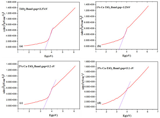 Tauc plots for bandgap analysis of (a) pristine TiO2, (b) 1 wt% Ca-TiO2, (c) 2 wt% Ca-TiO2, and (d) 3wt % Ca-TiO2.