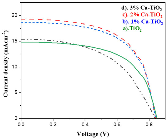 J-V characteristics of PSCs based on (a) undoped TiO2, (b) 1 wt% Ca doped TiO2, (c) 2 wt% Ca-doped TiO2 photo anodes, and (d) 3 wt% Ca-doped TiO2 photo anode.