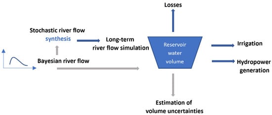 As described briefly in the introduction section, the potential of the reservoir for hydropower production is estimated by employing a Bayesian and a stochastic analysis of streamflow, which is then used for calculating the water balance of the reservoir, and thus, for the estimation of the hydropower potential. Specifically, the first step is the fitting of the marginal probability distribution function on the observed timeseries. Secondly, the posterior probability distribution of streamflow and reservoir water volume variations is estimated. Herein, the Bayesian method output is incorporated into a stochastic approach in terms of Monte Carlo simulations preserving the necessary number of moments of the marginal probability and second-order dependencies structures to simulate the river flow rate and the reservoir water balance under uncertainty, and finally, the last step is the estimation of the hydropower potential. An overview of the methodology applied and the reservoir schematic are shown in Figure 2. A detailed presentation of the aforementioned methodological steps is provided in the following paragraphs.
