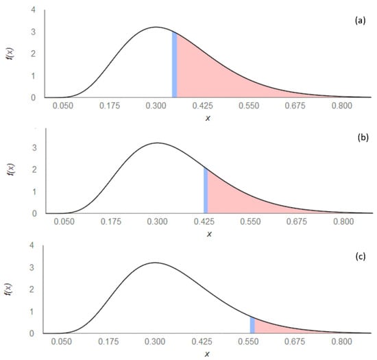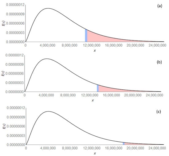Compound Gamma Probability distribution function of the reservoir water volume (x) providing the different f(x) values for the examined reservoir volumes: (a) 60%, (b) 75%, (c) 100% filled.