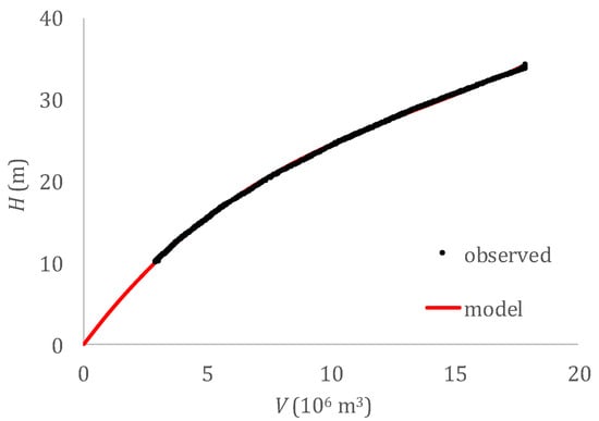 where V is the water volume (×106 m3) and H is the water level (m). The aim is to estimate, in this manner, the excess probability of the water volume and thus, to be able to decide on the available water volume for hydropower production as a function of the reliability and return period.