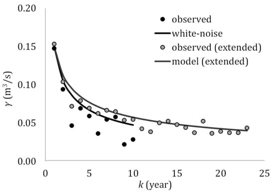 The estimated climacogram for the available river flow timeseries ranging from 1975 to 2019 (Figure 6) is best fitted by a white-noise process (i.e., all random variables of the river flow are independent of each other). However, this result may seem spurious given that it is rather unprecedented that future flows are completely independent of the past flows. In fact, it is shown that, in geophysical processes, a rather strong second-order dependence structure is found, which is characterized by a long-term persistent behavior [].