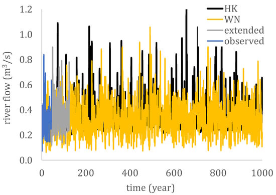 For the stochastic synthesis of the regular river flow process (Figure 7), we use the gamma probability distribution function, whereas for the extended flow process (Figure 6), we use the Symmetric-Moving-Average algorithm (Equation (11)) with following the gamma distribution Γ(κ,θ) with κ, θ: