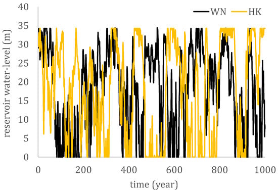 The above two Bayesian analyses for the water volume inside the reservoir and the upstream river flow resulted in different values for the return period of the required water level for hydropower production. Therefore, a stochastic approach is also applied, based on the Monte Carlo ensemble technique, to include information from both datasets. A synthetic river flow timeseries of 1000 years is produced by preserving its marginal structure, as derived in the previous sections (i.e., the gamma probability distribution function), as well as its second-order dependence structure to account for the autocorrelation of the river flow process.