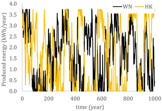 The synthetic timeseries of 1000 years following a WN and HK processes, both with probability distribution function Γ(κ,θ).