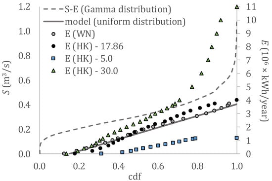 However, there are limitations in the proposed methodology that should be mentioned: for the application of the Bayesian framework, a good fit of a prior probability density function to the river flow process and to the water volume in the reservoir is required. Regarding the stochastic approach, a stationary model for the second-order dependence structure of the river flow timeseries is assumed, whereas for a non-stationary model, an appropriate transformation should apply. Finally, it is found that for a small-sized hydropower plant (as compared to the streamflow magnitude) the curvature of the probability distribution function of the produced energy can be assumed to be negligible as compared to that of the parent distribution of streamflow; it can therefore, be very well approximated by a uniform distribution. Interestingly, the sensitivity analysis performed in the frame of this work shows that the same loss of information occurs also for smaller-sized reservoirs due to the increase of overtopping, while for larger reservoir sizes the information of the distribution tails is preserved and even magnified (see Figure 10 for details).