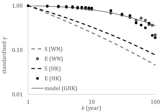 A possible reason for the above result may be that the sample length of the river flow is rather small, making the identification of any kind of dependence difficult to estimate from the data. Therefore, the extended river flow timeseries ranging from 2019 to 2099 is also included in the analysis, which is simulated with the RCP 2.6 scenario []. The climacogram of the latter extended timeseries exhibits a weak long-term persistent behavior, which is a stronger dependence structure than the white noise (WN) one (Figure 6). In this study, a stochastic simulation is performed for both cases, described through the second-order dependence structure expressed by the climacogram (Equation (11)) also called the Hurst-Kolmogorov process -HK-[].