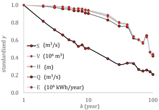 where we set , given that we are interested in the standardized climacogram for comparison between the two processes (i.e., streamflow and energy); q = 20 years is a scale parameter and the Hurst parameter is estimated to be Hu = 0.6 (adjusting for bias; []) which corresponds to a weak long-term persistent behavior (see Figure 12 for fitting).