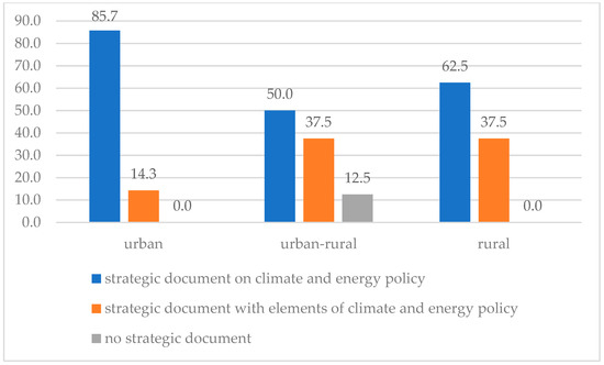 Municipal authorities plan their activities by developing strategic documents. This also applies to tasks in the area of implementing the climate and energy policy. In this case, city self-governments are in the lead, 85% of which have developed various strategies that are specifically dedicated to the implementation of energy transformation. In the case of the surveyed rural self-governments, approximately 62% of the communes have such documents. The percentage of urban–rural communes in this respect is even smaller, as only 50% of them have such strategies.