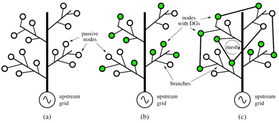 Different kinds of distribution networks. (a) Radial with passive nodes; (b) radial with distributed generators (DGs); (c) meshed with DGs.