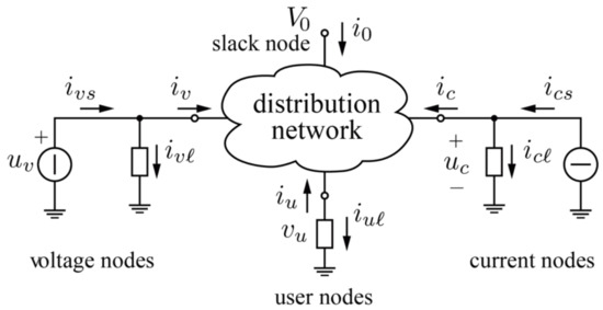 From the above considerations, it turns out that the input variables, determining the operation of the distribution network, are voltages impressed at voltage nodes, currents impressed at current nodes, and load currents . The output variables are currents entering the grid at voltage nodes, voltages at current nodes, and voltages at load nodes. We define, for convenience, user currents and user voltages as