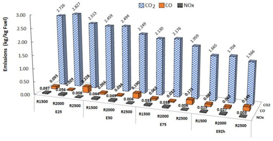 λ is the ratio between the actual air–fuel ratio (measured experimentally) and the stoichiometric air–fuel ratio. An engine operating with a higher ethanol content increases its mass flow. Consequently, with a reduction in the volume of gasoline, the temperature of the exhaust gases was lower. CO2 emissions decreased with an increase in ethanol at all speeds. For CO, at 1500 rpm, the emissions reduced by almost half from E25 to E50, but increased for E75 and E100. For 2000 rpm, CO emissions increased from E25 to E50, but then decreased for E75 and increased significantly for E100. For NOx emissions at 1500 rpm, there was an increase from E25 to E50, but then a progressive decrease for E75 and E100. At 2000 and 2500 rpm, NOx emissions progressively decreased with the content of ethanol. Figure 2 shows the variation in emissions per mass of fuel with the different fuels and engine speeds tested.