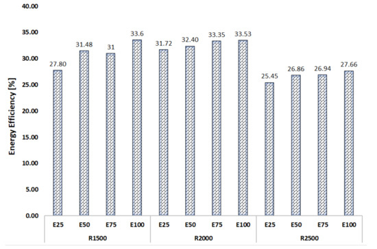 From Figure 3, it can be seen that as the content of ethanol increased, the energy efficiency also increased. The maximum energy efficiency values were obtained at 2000 rpm, followed by 1500 rpm and 2500 rpm.