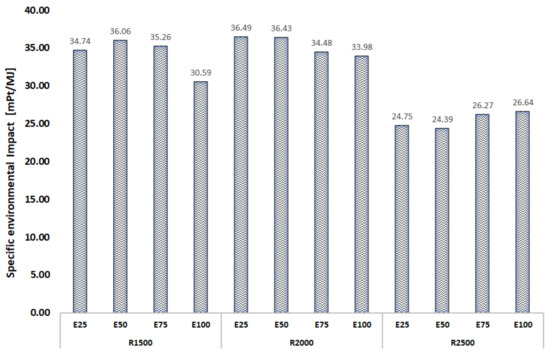 The specific environmental impact of brake power was evaluated by considering reallocation, according to Equation (15). As the ethanol content increased, the environmental impact rate of brake power reduced at low speeds such as 1500 and 2000 rpm. However, this behavior was the opposite at high speeds. The specific environmental impact of brake power comprised the environmental impact rate of the fuel (), the environmental impact rate of exergy loss (), and the environmental impact rate of pollutant formation (). As the ethanol content increased, there was an increase in the environmental impact rates associated with fuel and exergy losses, with a decrease in the environmental impact rate of pollutant formation.