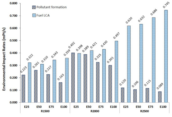The increase in the environmental impact rate of fuel () and the reduction in the environmental impact rate of pollutant formation () when the ethanol content increased can be seen in Figure 5.