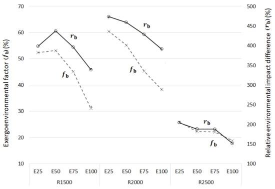 Figure 6 shows the exergoenvironmental factor (fb) on the primary y-axis (left) and the relative difference in environmental impact (rb) on the secondary y-axis (right).