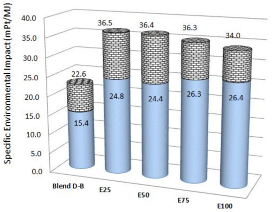 In the work of Cavalcanti et al. [35], diesel–biodiesel blends were studied, ranging from 5 to 100% biodiesel (D95B5 to B100). Pure biodiesel had the lowest environmental impact, 55.8 mPt/kg, while pure diesel had the highest value, 240 mPt/kg. Pure biodiesel produced the lowest specific environmental impact (15.4 mPt/MJ, the lowest value in Figure 7), at the expense of a slight decrease in exergy efficiency from 33.09% (D95B5) to 32.59% (B100). Here, the environmental impacts of ethanol and gasoline were 214 mPt/kg and 264 mPt/kg, respectively, which had the lowest specific environmental impacts in the range of 24.4–26.4 mPt/MJ (solid bars in Figure 7), while the highest were 34.0–36.5 mPt/MJ (dotted bars in Figure 7).