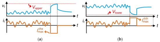 As shown in Figure 1a,b, the maximum peak current is defined as a constant current for 10 s, making the terminal voltage (vt) reach an upper or lower limit value (Vupper or Vlower) [23]. The time interval (Δt = 10 s) was determined considering that the instantaneous peak current generated during gradient climbing, rapid acceleration, and regenerative braking is generally shorter than 10 s [23,24].