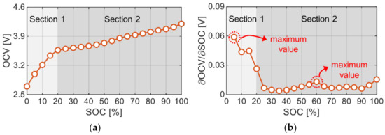 where max{Rs(t)}, min{Rs(t)}, and min(CAh) are the maximum or minimum values of each parameter among all cells in the battery pack. Considering that every cell has a different SOC because of the inconsistency in CAh, the ∂OCV/∂SOC in Equation (10) is determined as shown in Figure 3b, which can be expressed as follows: