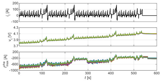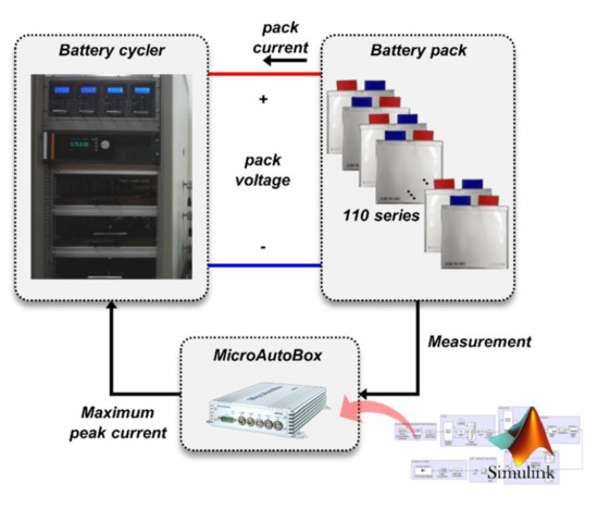 Figure 10 presents the experimental setup for the verification of the proposed algorithm. The proposed algorithm was implemented using MATLAB Simulink and loaded into MicroAutoBox. MicroAutoBox measures the it and vt of each cell in real time and uses these measured data for online screening and maximum peak current estimation. The cell parameters required in the proposed algorithm are obtained as follows: Rs is calculated in real-time using the relation between the change in it and vt; the method in [46] was implemented to estimate the SOC of each cell. The output current of the battery cycler is controlled such that the maximum peak current estimated form the MicroAutoBox was not exceeded.