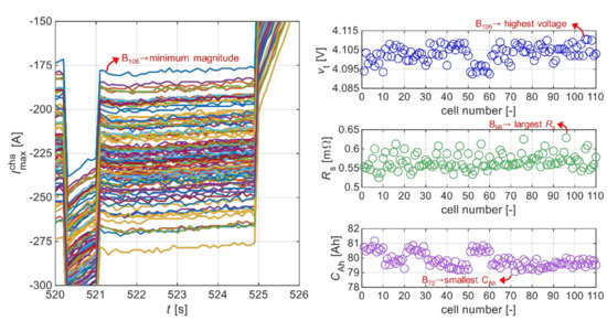 As can be seen in Equations (4) and (5), as the maximum peak current is dependent on CAh, Rs, and vt, the inconsistency of these parameters leads to the deviation in the maximum peak current. For further analysis, an experiment was performed to charge a battery pack consisting of 110 cells (B1–B110) with a new European driving cycle (NEDC) profile, and the of each cell was calculated using Equation (4), as shown in Figure 4. The characteristics of the battery pack and the identification results of the cell parameters are detailed in Section 4. As can be seen in the experimental results, the cells have the different values of due to the inconsistencies, and the weakest cell with the minimum magnitude of varied unpredictably while the NEDC profile was applied.