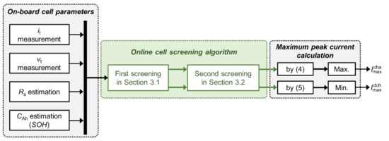 Therefore, this study proposes an online cell screening algorithm that outperforms conventional algorithms in the following aspects: first, the cell parameters that affect the maximum peak current were mathematically and experimentally analyzed based on the equivalent circuit model; second, the proposed algorithm ensures the inclusion of the weakest cell in the screening results by simultaneously considering the inconsistency in the current capacity, internal resistance, and terminal voltage; third, an actual EV battery pack, with 110 cells in series, was used to verify the feasibility of the proposed algorithms, and the computational time was evaluated to validate the complexity reduction effect compared to that of the direct method for estimating the maximum peak current of all of the cells.